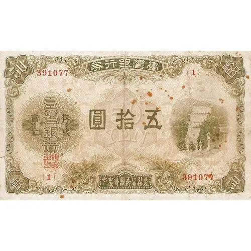 (Translation: Bank of Taiwan note Fifty Bank of Taiwan Fifty Yen In exchange for this note, a corresponding amount in yen shall be paid)