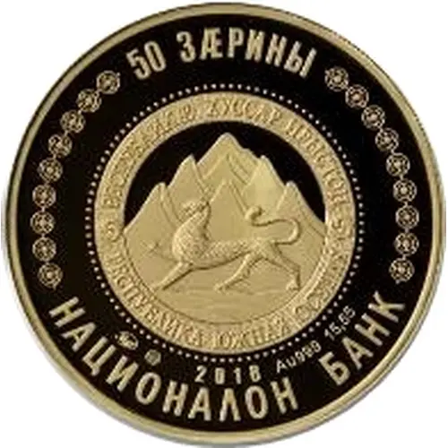 | Chữ khắc mặt trước | 50 ЗÆРИНЫ РЕСПУБЛИКӔ ХУССАР ИРЫСТОН РЕСПУБЛИКА ЮЖНАЯ ОСЕТИЯ ММД 2018 Au 925 15,55 НАЦИОНАЛОН БАНК (Translation: 50 Zarin Republic of South Ossetia MMD 2018 Au 925 15,55 National Bank) |