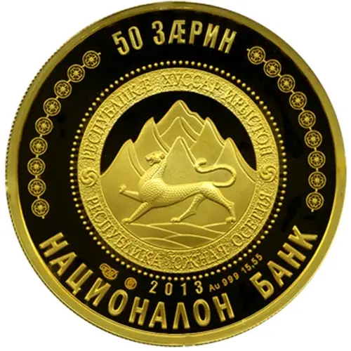 | Opis líce | 50 ЗÆРИН РЕСПУБЛИКӔ ХУССАР ИРЫСТОН РЕСПУБЛИКА ЮЖНАЯ ОСЕТИЯ СПМД 2013 Au 925 15,55 НАЦИОНАЛОН БАНК (Translation: 50 Zarin Republic of South Ossetia SPMD 2013 Au 925 15,55 National Bank) |