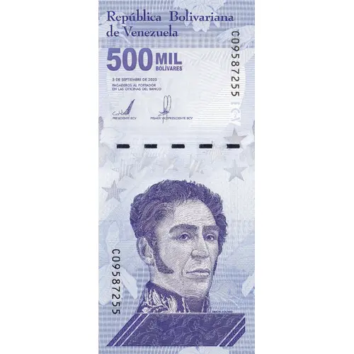 | Надписи лицевой стороны | República Bolivariana de Venezuela 500 MIL BOLIVARES (Translation: Bolivarian Republic of Venezuela Five Hundred Thousand Bolívares.) |