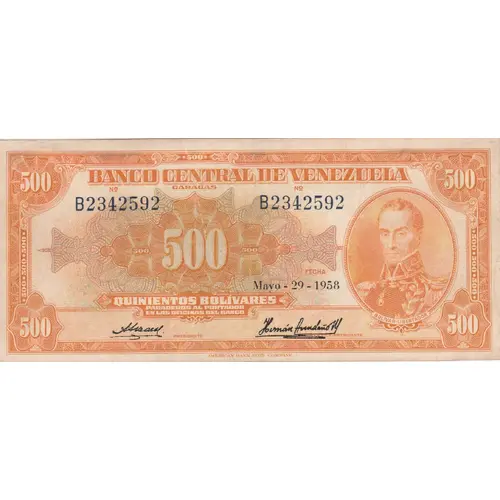 | Vorderseitenbeschreibung | Design in yellow with frame-like border. On the right, portrait of Simon Bolivar inside an oval from unknown author. In the center, the denomination value `500`, with the denomination in words `QUINIENTOS BOLÍVARES` «five hundred Bolívares» and the payment clause `PAGADEROS AL PORTADOR EN LAS OFICINAS DEL BANCO` «Payments to the Bearier in the Offices of the Bank» below. On the top, the issuer name `BANCO CENTRAL DE VENEZUELA` «Central Bank of Venezuela». In each corner the denomination value `500`. |