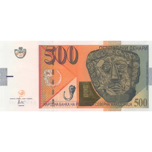 | Opis líce | Петстотни Денари Народна Ванка на Република Северна Македонија (Translation: Five Hundred Dinara National Bank of the Republic of Northern Macedonia) |