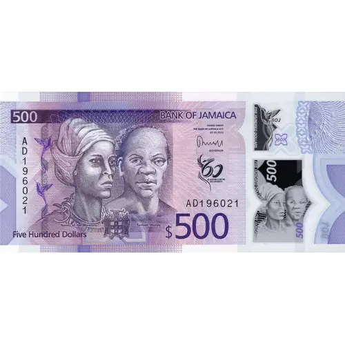 BANK OF JAMAICA 500 ISSUED UNDER THE BANK OF JAMAICA ACT 01.06.2022 GOVERNOR JAMAICA 60 RE-IGNITING A NATION FOR GREATNESS Nanny of the Maroons Samuel Sharpe $500 Five Hundred Dollars OUT OF MANY, ONE PEOPLE |