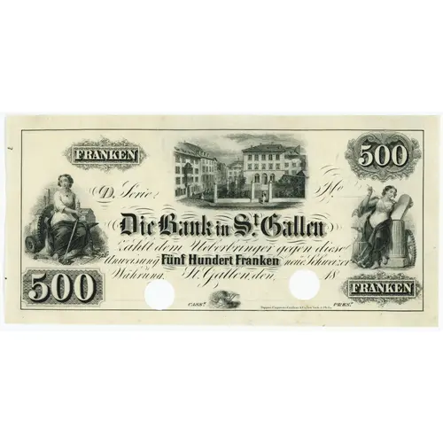 | Vorderseitenlegende | FRANKEN 500 Die Bank in Sᵗ. Gallen zahlt dem Ueberbringer gegen diese anweisung Fünf Hundert Franken neüe. Schweizer Währung. St. Gallen, den, _ 18 _ CASSᴿ. PRESᵀ. Toppan, Carpenter, Casilear & Co. New York & Phila. |