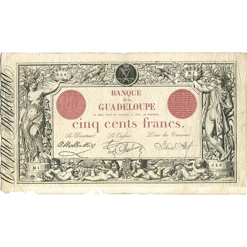 Obverse lettering BANQUE de la GUADELOUPE IL SERA PAYE EN ESPÈCE, A VUE, AU PORTEUR CINQ CENT FRANCS. BARRE F.