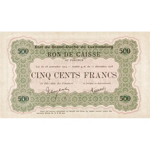 | Ön yüz lejandı | État du Grand-Duché de Luxembourg BON DE CAISSE AU PORTEUR Loi du 28 novembre 1914 - Arrêté g.-d. du 11 décembre 1918 CINQ CENTS FRANCS Le Dir.-Gén. des Finances Le Délégué du Government Ceux qui auront contrefait ou falsifié des Bons de caisse seront punis des travaux forcés de 15 à 20 ans. (Translation: State of the Grand Duchy of Luxembourg Cash Voucher To Bearer Law of November 28, 1914 - General Decree from December 11, 1918 Five Hundred Francs The Director-Gen. of Finance / The Government Delegate Those who have counterfeited or falsified Cash Vouchers will be punished with forced labor for 15 to 20 years.) |