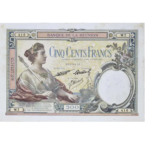 | Legenda del dritto | BANQUE DE LA RÉUNION 500 CINQ CENTS FRANCS PAYABLE EN ESPECES, A VUE; AU PORTEUR H. DANGER FEC. RITA SC. (Translation: Bank of Reunion Five Hundred Francs payable in cash to bearer Article 129 of the Penal Code finishes forced labor in perpetuity for the counterfeiter.) |