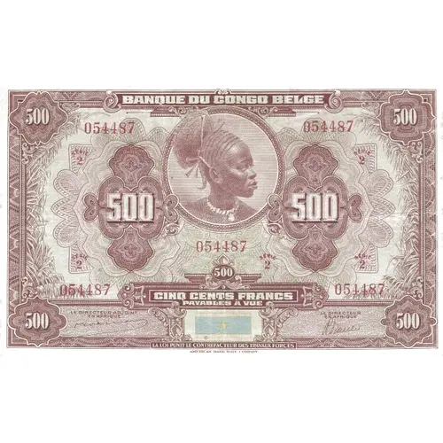 | Légende du revers | BANK VAN BELGISCH CONGO VIJF HONDERD FRANK BETAALBAAR OP ZICHT DE NAMAKER WORDT DOOR DE WET MET DWANGARBEID GESTRAFT |