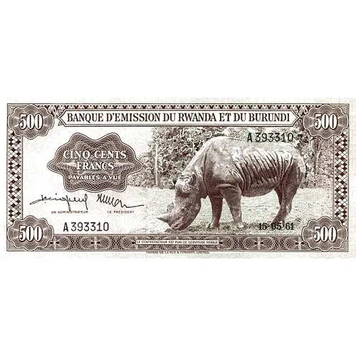 | Rückseitenlegende | BANQUE D`EMISSION DU RWANDA ET DU BURUNDI CINQ CENT FRANCS |