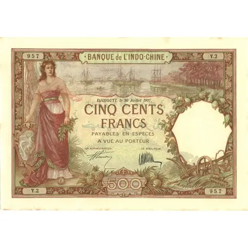 | Opis líce | • BANQUE DE L`INDO-CHINE • DJIBOUTI, le 20 Juillet 1927. CINQ CENT FRANCS PAYABLES EN ESPÈCES A VUE AU PORTEUR UN ADMINISTRATEUR LE DIRECTEUR 500 G. FRAIPONT FC E. GASPÉ SC (Translation: Bank of Indochina. Djibouti, July 20, 1927. Five hundred francs. Payable in cash to bearer. An administrator, the director.) |