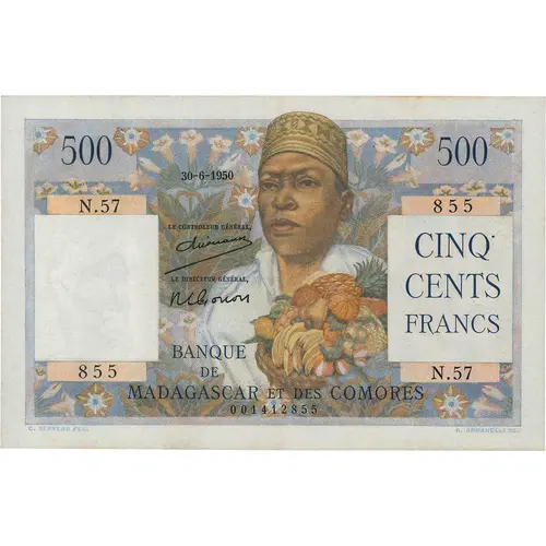 | Legenda del dritto | 500 Le directeur général adjoint le president directeur général CINQ-CENTS FRANCS BANQUE DE MADAGASCAR ET DES COMORES C. SERVEAU FEC. R. ARMANELLI SC. (Translation: 500 The Deputy Director General (signature) The Chief Executive Officer (signature) FIVE HUNDRED FRANCS BANK OF MADAGASCAR AND COMOROS (ISLANDS)) |