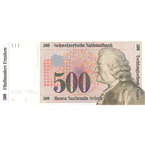 500 Fünfhundert Franken Der Präsident des Bankrates Ein Mitglied des Direktoriums Albrecht von Haller 1708-1777 500 500 Schweizerische Nationalbank 500 Banca Naziunala Svizra 500 Tschintgtschent Francs |
