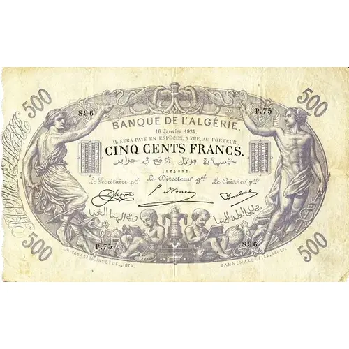 | Obverse lettering | Banque de l`Algérie Il sera paye en espèces, a vue, au porteur Cinq Cents Francs GA-CABASSON, INV ET DEL, 1873. PANNEMAKER FILS SC. (Translation: Bank of Algeria There will be paid in specie, on sight, to the bearer Five Hundred Francs) |