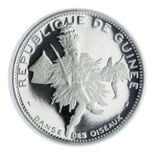 | Opschrift voorzijde | REPUBLIQUE DE GUINEE DANSE DES OISEAUX (Translation: Republic of Guinea Dance of the Birds) |
