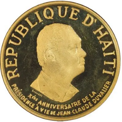 Leyenda del anverso REPUBLIQUE D`HAITI SOCCORSI XÉME ANNIVERSAIRE DE LA PRÉSIDENCE À VIE DE JEAN-CLAUDE DUVALLER