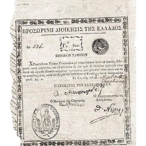 | Mô tả mặt trước | Text with denomination at centre, seal of the Provisional Administration of Greece at lower-right. |
