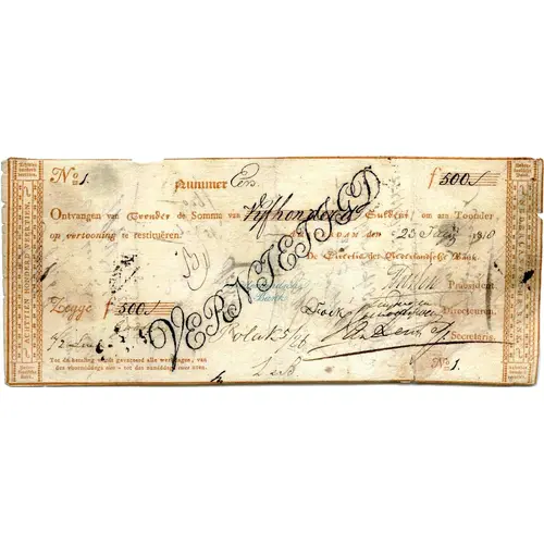 (Translation: Bank of Netherlands. Received from Bearer the Somma of a Five Hundred Guilders, to restimese to Bearer upon presentation. Amsterdam, the July 23, 1818. Bank of Netherlands. President - Director - Secretary Five Hundred Gulden)
