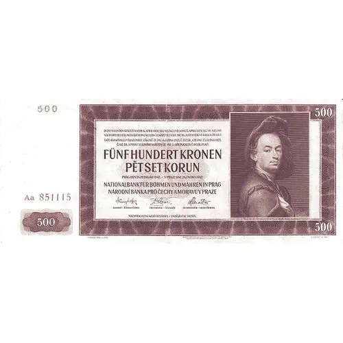 Obverse lettering 500                     500 DIESE NACH DEN GESETZEN VOM 14.APRIL 1920, SLG. NR. 347, UND VOM23.APRIL 1925, SLG. NR.102, UND NACH DER REGIERUNGSVERORDNUNG VOM 31. MÄRZ 1939, SLG. NR. 96, AUSGEGEBENE BANKNOTE GILT: TATO BANKOVA, VYDANÁ PODLE ZÁKONU ZE DNE 14. DUBNA 1920, Č. 347, SB. A ZE DNE 23. DUBNA 1925, Č. 102, SB. A PODLE VLÁDNÍHO NAŘÍZENÍ ZE DNE 31. BŘEZNA 1939, Č. 96, SB., PLATÍ: FÜNF HUNDERT KRONEN PĚT SET KORUN PRAG, DEN 24. FEBRUAR 1942. - V PRAZE DNE 24. ÚNORA 1942. NATIONALBANK FÜR BÖHMEN UND MÄHREN IN PRAG NÁRODNÍ BANKA PRO ČECHY A MORAVU V PRAZE J 400882 BANKRAT - BANKOVNÍ RADA GOUVERNEUR - GUVERNÉR OBERDIREKTOR - VRCHNÍ ŘEDITEL NACHMACHUNG WIRD BESTRAFT. - Padělání se trestá.  PETER BRANDL 1668 - 1735 500                     500 P. BRANDL PINX. cca 1695.      J. SCHMIDT SC. 1942 BANKNOTENDRUCKEREI DER NATIONALBANK FÜR BÄHMEN UND MÄHREN IN PRAG TÍSKÁRNA BANKOVEK NÁRODNÍ BANKA PRO ČECHY A MORAVU V PRAZE