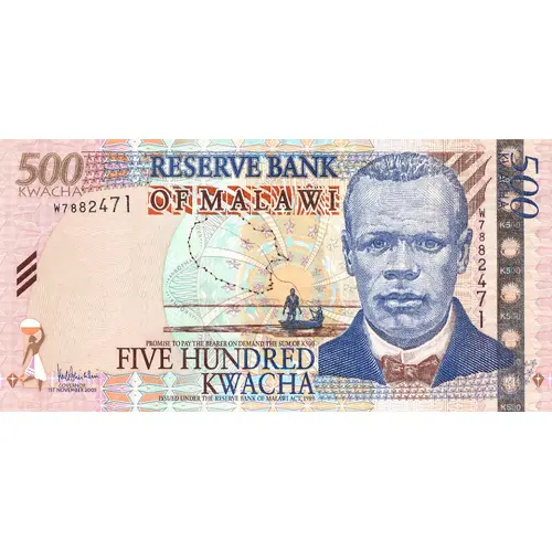 Obverse lettering RESERVE BANK OF MALAŴI PROMISE TO PAY THE BEARER ON DEMAND K500 FIVE HUNDRED KWACHA