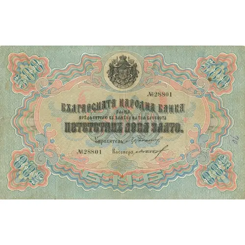 | نوشتههای روی اسکناس | Петстотинъ Лева Злато Българската Народна Банка Плаща Прѣдѫвителю въ замѣна на таѫ банкнота (Translation: Five Hundred Leva Gold The Bulgarian National Bank Pays the Bearer for exchange of this banknote) |