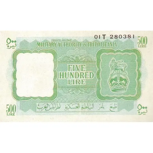 | Vorderseitenlegende | ISSUED BY THE MILITARY AUTHORITY IN TRIPOLITANIA FIVE HUNDRED LIRE |