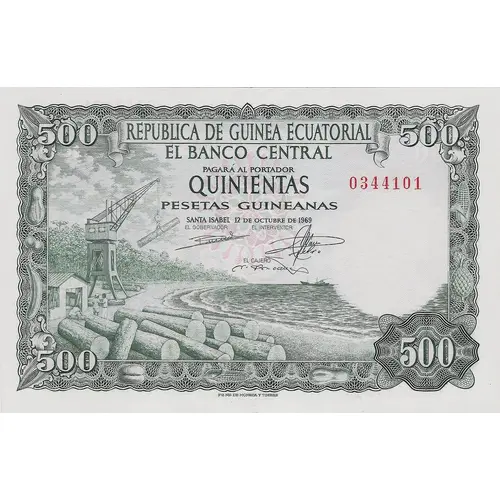| Надписи лицевой стороны | REPUBLICA DE GUINEA ECUATORIAL EL BANCO CENTRAL PAGARÁ AL PORTADOR QUINIENTAS PESETAS GUINEANAS SANTA ISABEL, 12 DE OCTUBRE DE 1969 (Translation: Republic of Equatorial Guinea The Central Bank will pay to the bearer Five Hundred Guinean Pesetas Santa Isabel, October 12, 1969) |