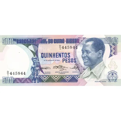 (Translation: National Bank of Guinea-Bissau Five Hundred Pesos February 28, 1983)