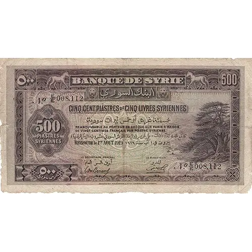 | Opschrift voorzijde | BANQUE DE SYRIE CINQ CENT PIASTRES OU CINQ LIVRES SYRIENNES REMBOURSABLE AU PORTEUR EN CHÈQUE SUR PARIS À RAISON DE VINGT CENTIMES FRANÇAIS PAR PIASTRE SYRIENNE |