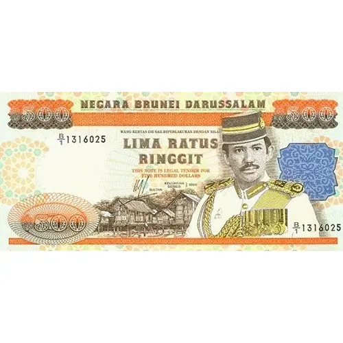 | 表面の銘文 | NEGARA BRUNEI DARUSSALAM WANG KERTAS INI SAH DIPERLAKUKAN DENGAN NILAI LIMA RATUS RINGGIT THIS NOTE IS LEGAL TENDER FOR FIVE HUNDRED DOLLARS SULTAN |