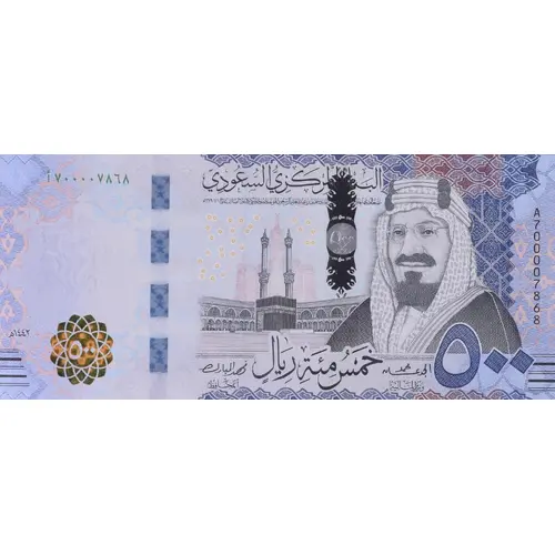 King Abdulaziz with Electrotype Coat of Arms, 500, and Cornerstones.Holographic Stripe. Motion Windowed Security Thread with 500 and Coat of arms. Solid Security Thread with demetallized SAMA 500. |