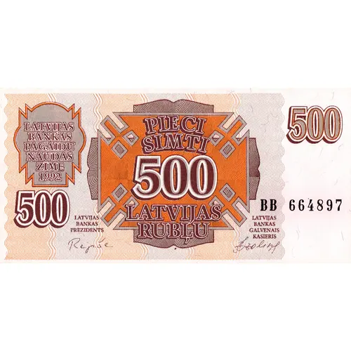 | Opis rubu | PIECI SIMTI LATVIJAS RUBĻU (Translation: Five Hundred Latvian Roubles) |