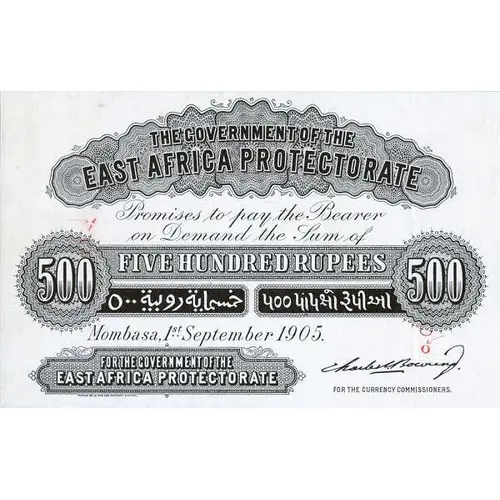 | Vorderseitenlegende | THE GOVERNMENT OF THE EAST AFRICA PROTECTORATE Promises to pay the Bearer on Demand the Sum of FIVE HUNDRED RUPEES Mombasa, 1st September 1905. FOR THE GOVERNMENT OF THE EAST AFRICA PROTECTORATE |