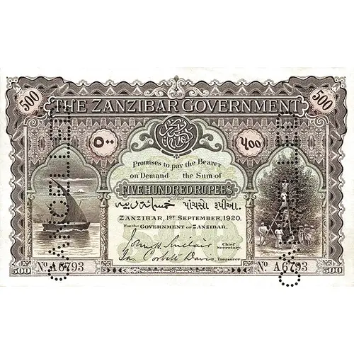 | 表面の銘文 | THE ZANZIBAR GOVERNMENT ٥٠٠ ૫૦૦ PROMISES TO PAY THE BEARER ON DEMAND THE SUM OF FIVE HUNDRED RUPEES خمسمائة روبية પાંચસો રૂપિયા ZANZIBAR FOR THE GOVERNMENT OF ZANZIBAR (Translation: 500 500 Five hundred rupees five hundred rupees) |