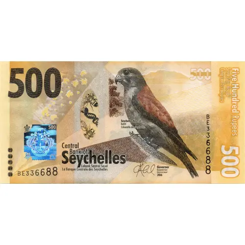 | Opschrift voorzijde | Five Hundred Rupees Senk San Roupi Cinq cents Roupies |