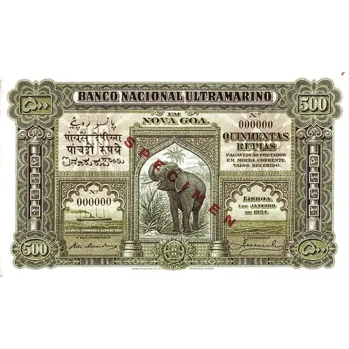 panel at Lettering: BANCO NACIONAL ULTRAMARINO NOVA GOA QUINHENTAS RUPIAS LISBOA, 1deJANEIROde1924 Reverse Potrait of Ship in center Inscription of `BANCO NATIONAL` at top Inscription of `ULTRAMARINO` at bottom |
