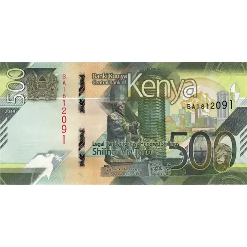 (Translation: Central Bank of Kenya Tourism, wildlife, lion Five hundred shillings)