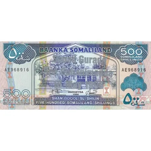 | Opschrift keerzijde | BANKAA SOMALILAND SHAN BOQOL SL SHILIN FIVE HUNDRED SOMALILAND SHILLINGS ٥٠٠ شن (Translation: Bank of Somaliland Five Hundred Somaliland Shillings.) |