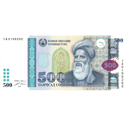 (Translation: National Bank of Tajikistan, Five Hundred Somonī)