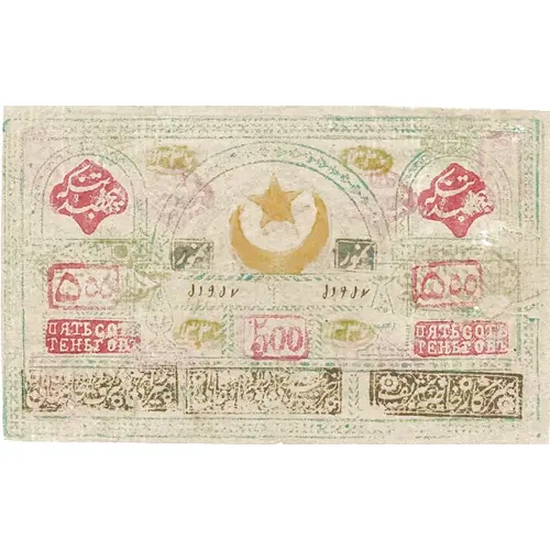 | Leyenda del anverso | ۱۳۳۷ ۵00 500 ПЯТЬСОТЪ ТЕНЬГОВЪ (Translation: 1337, 500, Five Hundred Tengov) |