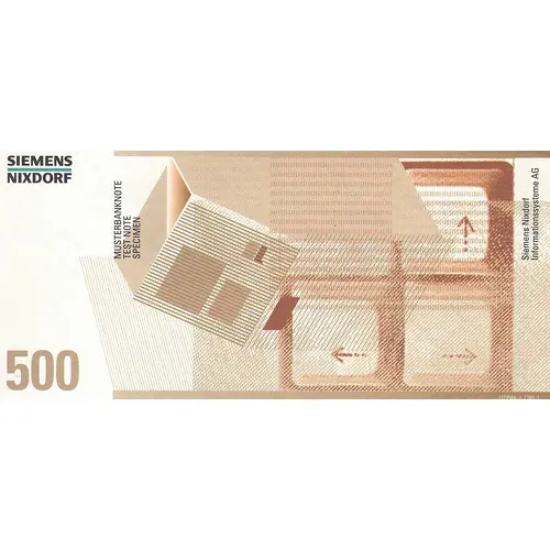 | Ön yüz lejandı | SIEMENS NIXDORF 500 MUSTERBANKNOTE TEST NOTE SPÉCIMEN Siemens Nixdorf Informationsysteme AG U23544-J-Z749-1 |