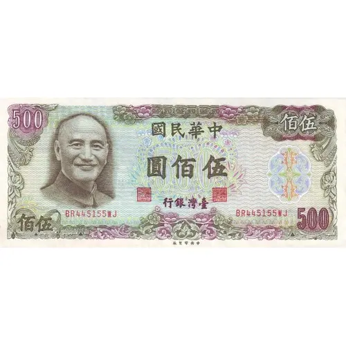 | Opis líce | 500 佰伍 國民華中 圓佰伍 行銀灣臺 佰伍 500 (Translation: Republic of China Five Hundred Yuan Bank of Taiwan) |