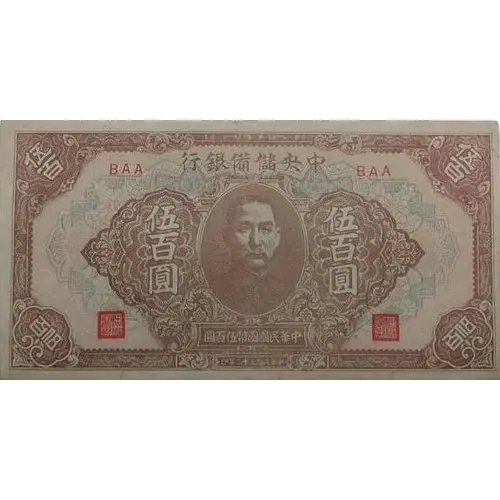 | Rückseitenlegende | THE CENTRAL RESERVE BANK OF CHINA 500 GOVERNOR VICE GOVERNOR FIVE HUNDRED YUAN 1943 |