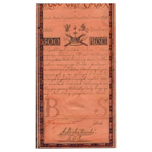 Uchwała Rady Najwyższey Narod:Dnia 8. Czerw. 1794. Bilet skarbowy 500 PIĘĆSET Na Pięćset Złotych polskich rachując z jedney Grzywny Kolońskiey Zlt.ch pol.ch 841/2 Monety Srebrney:/które Skarb Narodowy każdemu Ukazicielowi ninieyszego Biletu z funduszow na umorzenie Biletow Skarbowych przeznaczonych y na ogólnych Dobrach Narodowych hypotekowanych oraz we wszelkich dochodach Publicznych według powyższey Uchwały Rady Najwyższey Narodowey przyjmować będzie. (Translation: Resolution of the highest national council, June 8th, 1794. Treasury Note 500 Five Hundred For five hundred Polish zlotys counting from one Cologne mark Polish Złotych 841/2 silver coin, which the National Treasury will pay to every bearer of this note from the funds for the remission and the National mortgated funds and all public funds according to the Highest National Council will accept [this note].) |