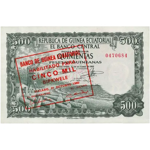 | Obverse lettering | REPUBLICA DE GUINEA ECUATORIAL EL BANCO CENTRAL PAGARÁ AL PORTADOR QUINIENTAS PESETAS GUINEANAS SANTA ISABEL, 12 DE OCTUBRE DE 1969 BANCO DE GUINEA ECUATORIAL HABILITADO PARA CINCO MIL BIPKWELE MALABO, 21 OCTUBRE 1980 (Translation: Republic of Equatorial Guinea The Central Bank pay to bearer Five Hundred Pesetas Guineanas Santa Isabel, October 12, 1969 Bank of Equatorial Guinea Valid for Five Thousand Bipkwele Malabo, October 21, 1980) |