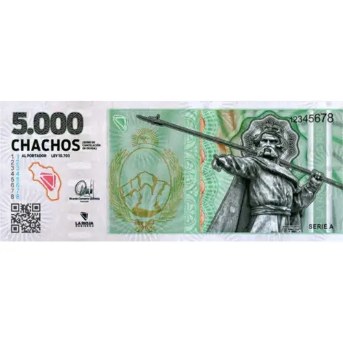 | Obverse lettering | 5.000 CHACHOS (BONO de CANCELACIÓN de DEUDA) AL PORTADOR LEY 10.703 LA RIOJA Gobierno Ángel Vicente Peñaloza (Translation: 5,000 CHACHOS (DEBT CANCELLATION BONUS) TO THE BEARER LAW 10,703 LA RIOJA Government Ángel Vicente Peñaloza) |