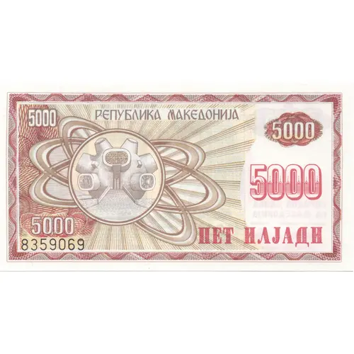 | Legenda del rovescio | РЕПУБЛИКА МАКЕДОНИЈА 5000 ПЕТ ИЛЈАДИ (Translation: Republic of Macedonia, Five Thousand) |