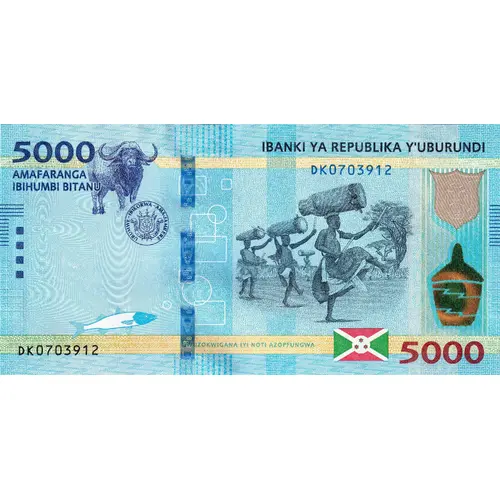 | Arka yüz lejandı | BANQUE DE LA REPUBLIQUE DU BURUNDI CINQ MILLE FRANCS LE CONTREFACTEUR EST PUNI DE SERVITUDE PENALE LE GOUVERNEUR LE 1er VICE-GOUVERNEUR 04-07-2018 5000 (Translation: Bank of the Republic of Burundi. Five thousand francs. The counterfeiter is punished with penal servitude. The governor, the 1st vice governor.) |