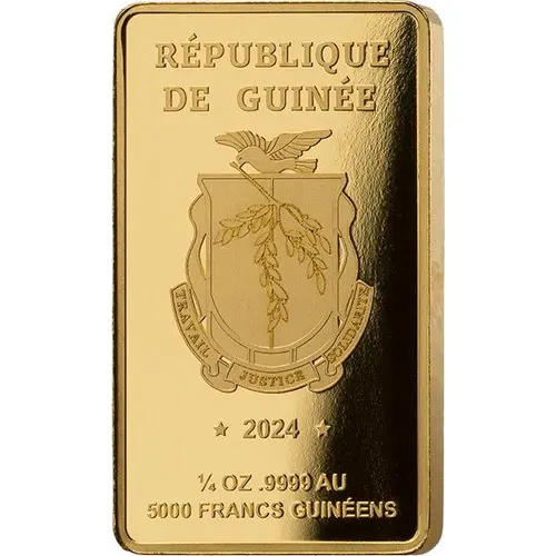 RÉPUBLIQUE DE GUINÉE TRAVAIL JUSTICE SOLIDARITE 2024 ¼ OZ .9999 AU 5000 FRANCS GUINÉENS (Translation: Republic of Guinea Work Justice Solidarity 5000 Guinean francs) |