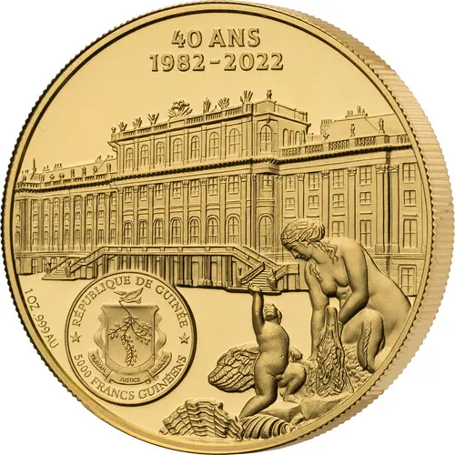 40 ANS 1982-2022 1 OZ .999AU RÉPUBLIQUE DE GUINÉE TRAVAIL JUSTICE SOLIDARITÉ 5000 FRANCS GUINÉENS (Translation: Republic of Guinea Work Justice Solidarity 5000 Guinean Francs) |