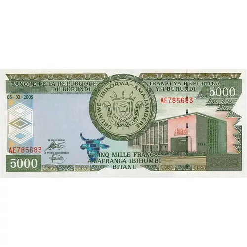 | Vorderseitenlegende | BANQUE DE LA REPUBLIQUE DU BURUNDI IBANKI YA REPUBLIKA Y`UBURUNDI CINQ MILLE FRANCS AMAFRANGA IBIHUMBI BITANU UBUMWE - IBIKORWA - AMAJAMBERE UNITE - TRAVAIL - PROGRESS LE GOVERNEUR LE 1er VICE GOVERNEUR 05-02-2005 5000 (Translation: Bank of the Republic of Burundi. Five thousand francs. Unity, work, progress. The governor, the 1st vice governor.) |